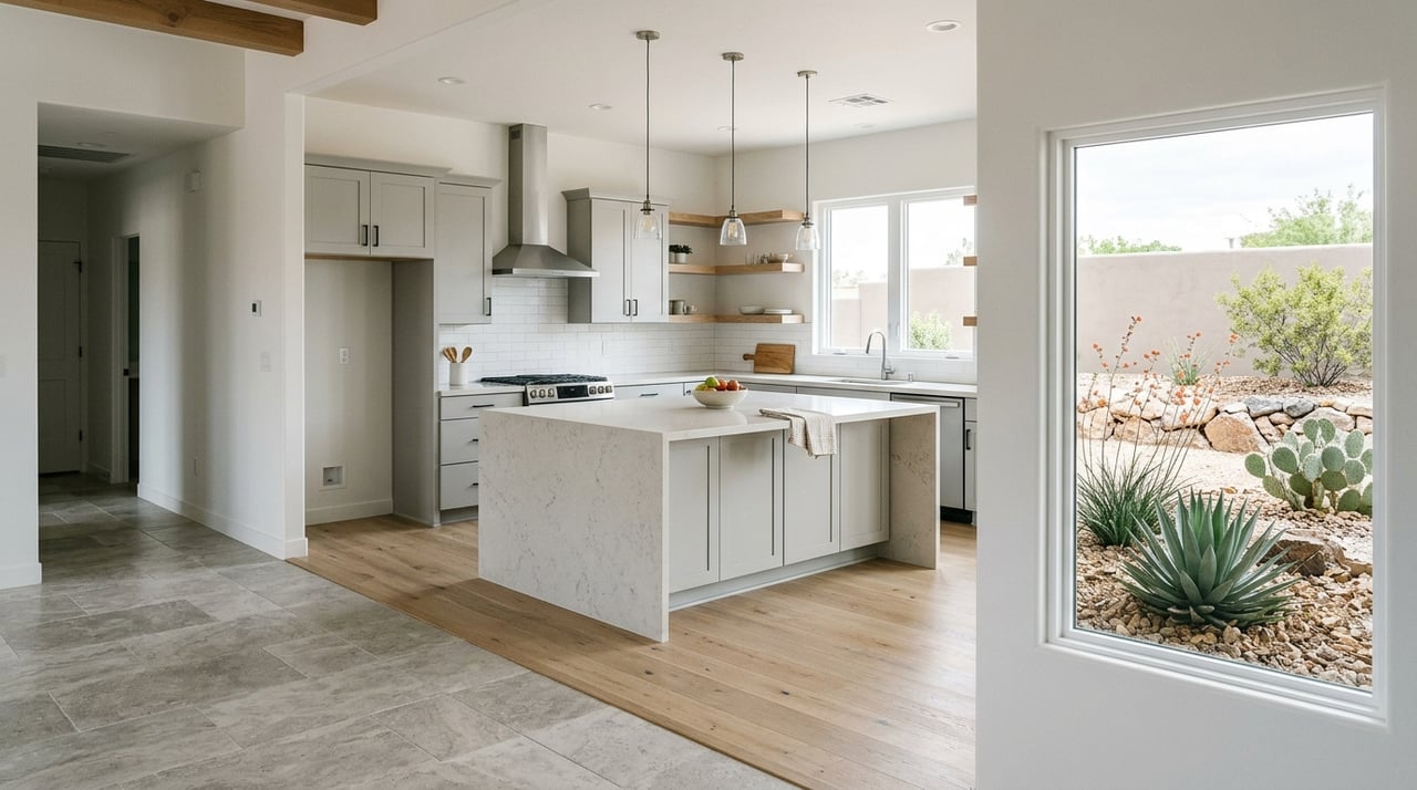 Materials that feel natural underfoot and cool to the touch work well indoors. Stone and large-format porcelain tile are common, while engineered wood and wood-look tile add warmth. Desert-modern interiors often combine a neutral base with tactile materials, sculptural lighting, and one signature stone or plaster feature. For design vocabulary and climate-smart material ideas, see this guide to desert-modern interiors.